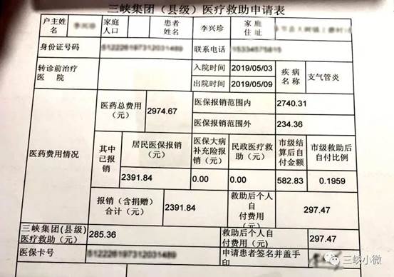受助患者醫(yī)療報(bào)銷單據(jù)中的三峽集團(tuán)(縣級(jí))醫(yī)療救助申請(qǐng)表