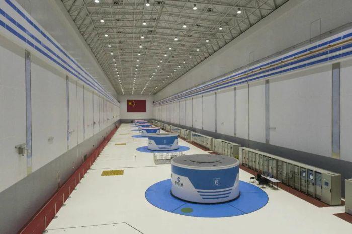 長龍山電站坐落在群山之間,沿進(jìn)廠交通洞向山體內(nèi)行進(jìn)1.2公里,來到長龍山電站的廠房。232米長的廠房內(nèi),6臺35萬千瓦的機(jī)組一字排開,其中4臺機(jī)組上方亮起一圈紅色燈光,通過機(jī)頂罩的小窗口可以看到飛速旋轉(zhuǎn)的轉(zhuǎn)子。