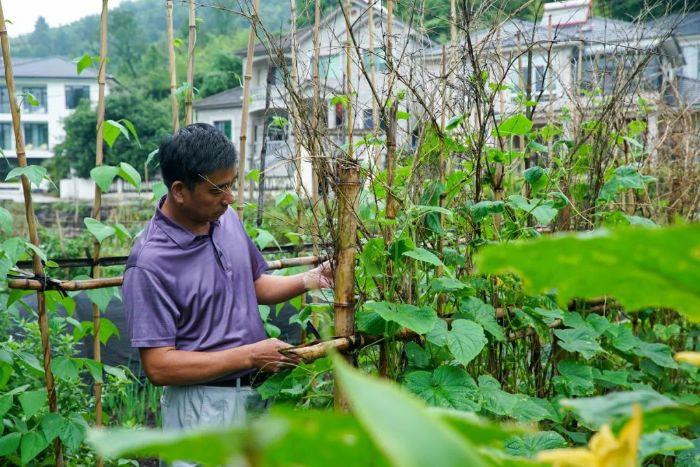 ▲高成賢在打理菜園 攝影:崔徐波