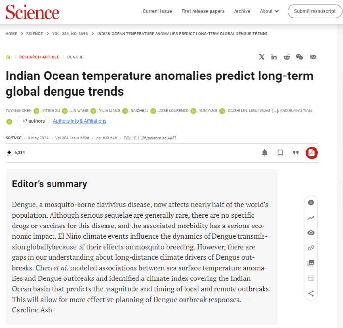 國(guó)家工程中心科研人員陳宇楊作為第一作者,在《科學(xué)》發(fā)表《印度洋溫度異常預(yù)測(cè)全球登革熱長(zhǎng)期趨勢(shì)》一文,該文以三峽集團(tuán)長(zhǎng)江流域氣候預(yù)測(cè)與環(huán)境評(píng)估研究工作為基礎(chǔ),開發(fā)基于氣候預(yù)測(cè)的環(huán)境健康模型。該模型可將登革熱流行預(yù)警提前9個(gè)月,可靠性大幅提升至70%,在氣候變化和流域環(huán)境健康前沿研究領(lǐng)域取得重大創(chuàng)新突破。后續(xù),研究團(tuán)隊(duì)將進(jìn)一步優(yōu)化氣候預(yù)測(cè)模型,為三峽集團(tuán)水風(fēng)光資源預(yù)測(cè)和城市內(nèi)澇風(fēng)險(xiǎn)預(yù)警提供有力支撐。